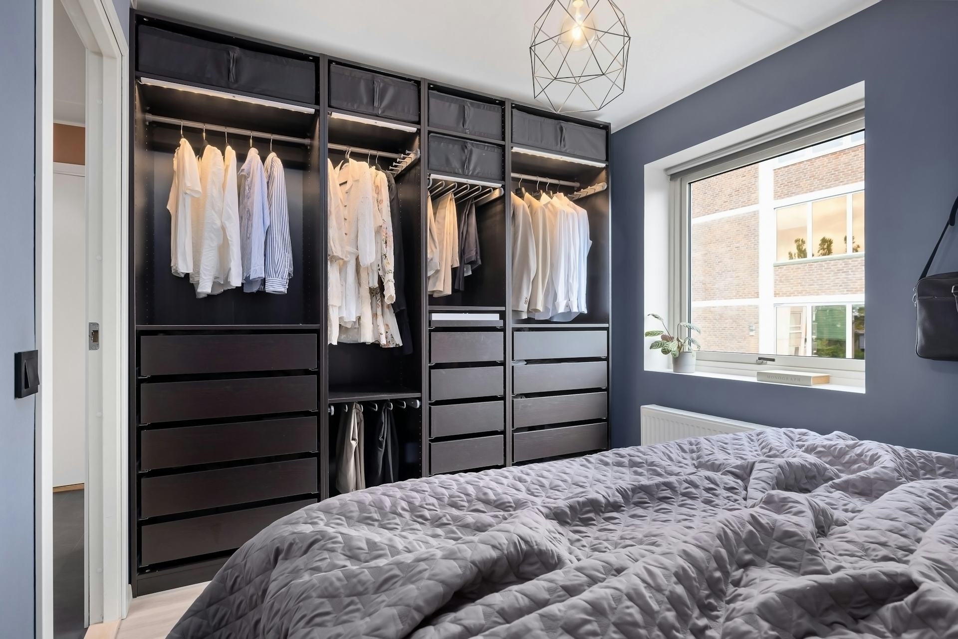 Häng det du använder mest i ögonhöjd, och förvara säsongsplagg i lådor eller på översta hyllorna. Använd lådor till småsaker som underkläder och accessoarer, och överväg belysning i garderoben för att lättare hitta det du söker. När allt har sin plats blir det enklare att välja kläder – och du undviker onödiga dubbelköp.